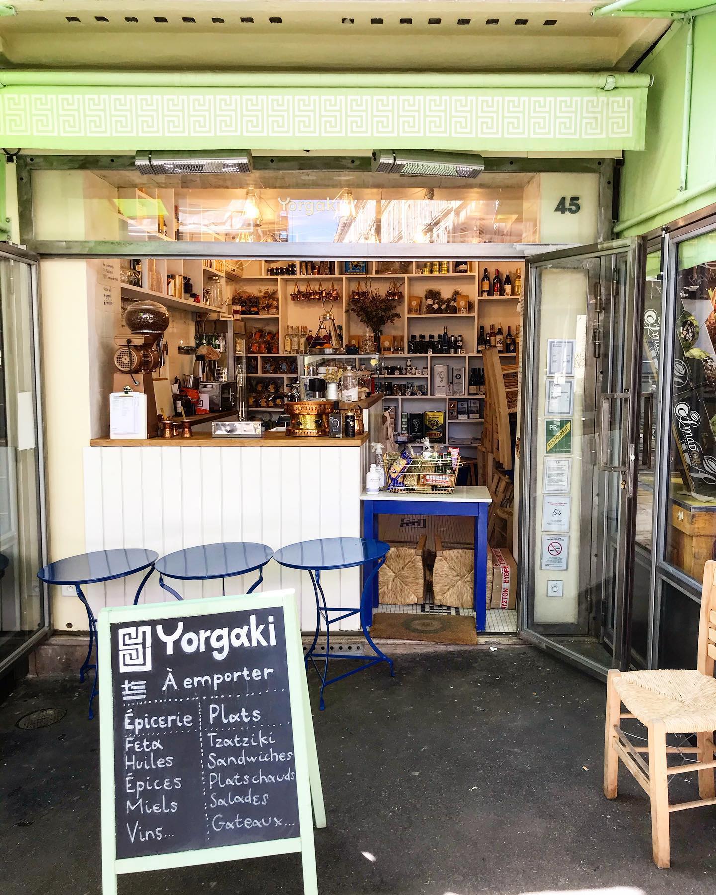 Στο καφενείο Yorgaki δεν είναι λίγοι εκείνοι που έρχονται για να κάνουν τα ψώνια τους αφού το κατάστημα λειτουργεί και ως μίνι παντοπωλείο. Στα ράφια του οι παριζιάνοι βρίσκουν καθημερινά ελληνικά προϊόντα, από κριθαράκι και κρακεράκια της εταιρίας Παπαδοπούλου μέχρι παξιμάδια και τσίχλες Big Babol. Αυτό όμως που έχει την μεγαλύτερη επιτυχία δεν είναι άλλο από τα μεγάλα κουτιά με πουράκια Caprice, ένα μοναδικό γλύκισμα που αγαπάμε ιδιαίτερα στην Ελλάδα και το οποίο η ομάδα του Yorgaki έχει καταφέρει να κάνει αναπόσπαστο κομμάτι της καθημερινότητας των ξένων θαμώνων του μαγαζιού. Επίσης, παξιμάδια, αποξηραμένα σύκα και τα γνωστά μπισκότα Πτι- Μπερ.